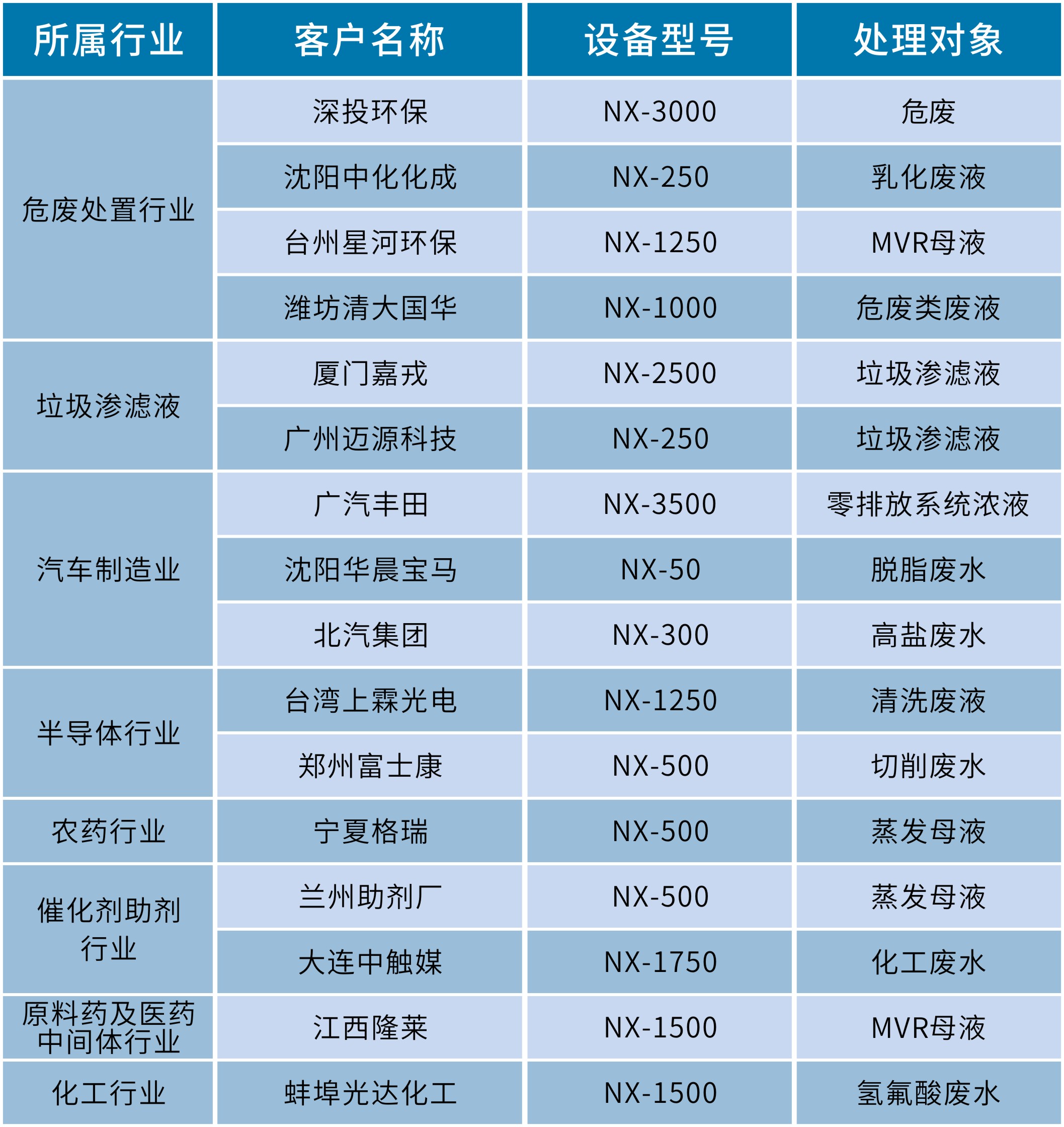 國(guó)內(nèi)超過120個(gè)案例,涵蓋多個(gè)行業(yè),包括危廢處置行業(yè)、化工行業(yè)、醫(yī)藥行業(yè)、汽車制造行業(yè)、垃圾滲濾液處理等等